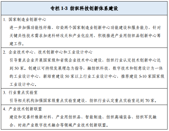 2.完善科技創新體系。加快建設以市場為導向、以企業為主體、產學研用相結合的科技創新體系,構建紡織全產業鏈創新平臺。積極推進國家制造業創新中心、國家認定企業技術中心、國家認定企業工業設計中心、行業重點實驗室和技術創新中心、產業技術創新聯盟、產學研用聯合體等創新平臺建設,加強交叉學科、跨領域合作創新平臺建設,建立創新平臺協同機制,促進行業關鍵共性技術研發與成果轉移轉化。