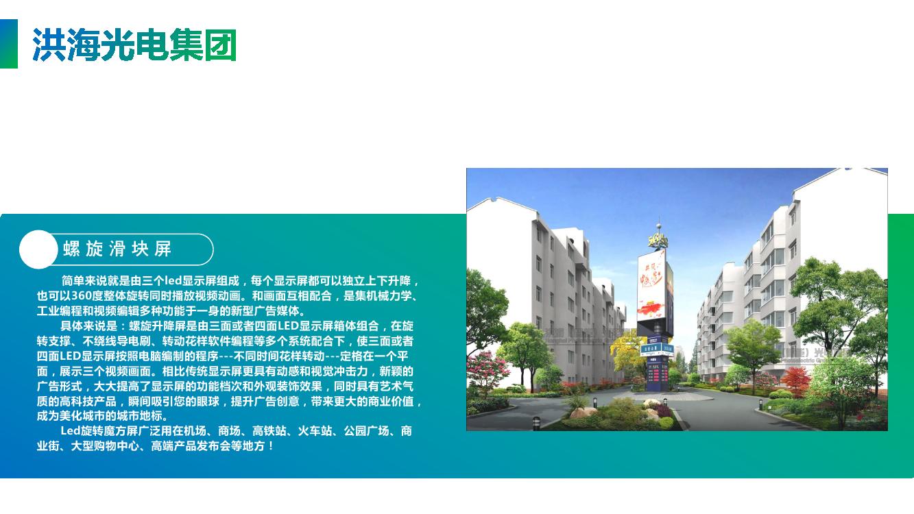 具體來說是:螺旋升降屏是由三面或者四面LED顯示屏箱體組合,在旋轉支撐、不繞線導電刷、轉動花樣軟件編程等多個系統配合下,使三面或者四面LED顯示屏按照電腦編制的程序---不同時間花樣轉動---定格在一個平面,展示三個視頻畫面。相比傳統顯示屏更具有動感和視覺沖擊力,新穎的廣告形式,大大提高了顯示屏的功能檔次和外觀裝飾效果,同時具有藝術氣質的高科技產品,瞬間吸引您的眼球,提升廣告創意,帶來更大的商業價值,成為美化城市的城市地標。Led旋轉魔方屏廣泛用在機場、商場、高鐵站、火車站、公園廣場、商業街、大型購物中心、高端產品發布會等地方。